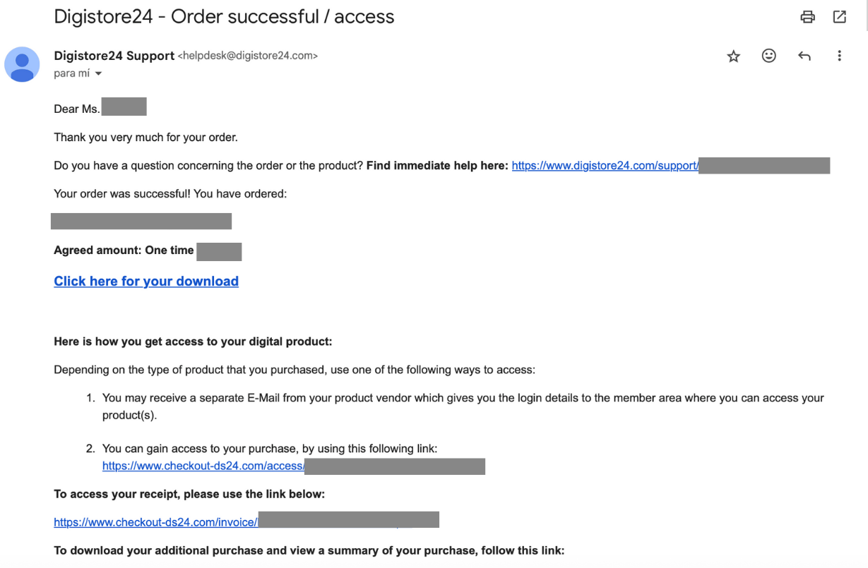 To get access to all the products hou have purchased, check your inbox for an email from Digistore24 Support <helpdesk@digistore24.com> with subject line: Digistore24 – Order Successful/ Access